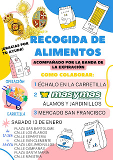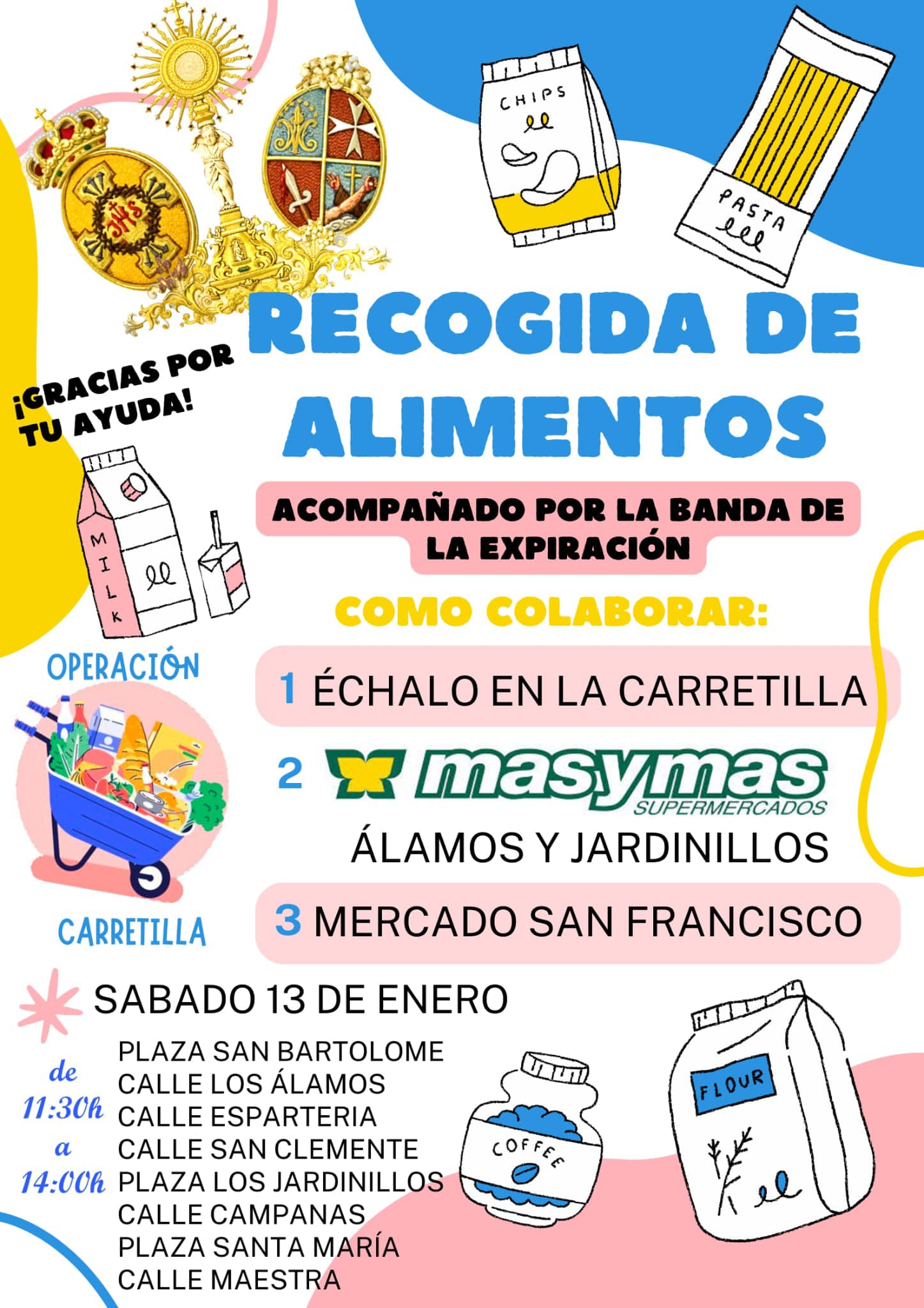 El sábado 13 de enero tendrá lugar la recogida de alimentos que organiza la Hermandad de la Expiración. Todo lo recogido será entregado a los más necesitados. Se podrá colaborar entregando los alimentos en los supermercados Masymas de la calle los Álamos y Plaza de los Jardinillos, en el Mercado de Abastos de San Francisco o entregándolos en la carretilla que miembros del Grupo Joven de la Hermandad llevarán durante el recorrido que comenzará a las 11:30 discurriendo por Plaza San Bartolomé, Audiencia, Álamos, Espartería, San Clemente, Jardinillos, Campanas, Plaza de Santa María, Maestra y regreso hacía San Bartolomé. Su término está previsto para las 14:00 horas. La Operación Carretilla estará acompañada por la Banda de Cornetas y Tambores de la Expiración.